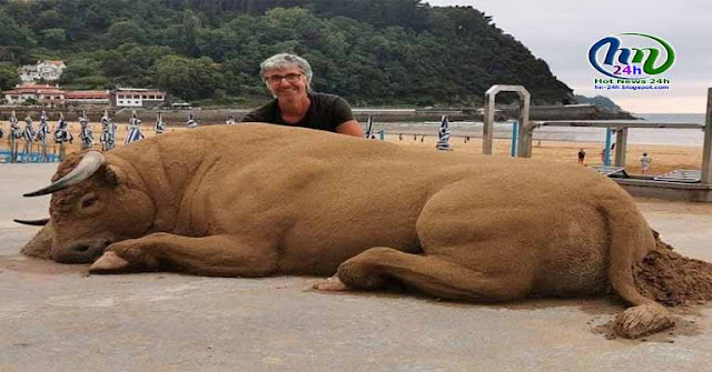 Bastarrika loves to surf the beach and often build sand sculptures into animals such as crocodiles, whales, squid and tigers. And recently, a cow statue seems to be exploding on social media because of its size and shape compared to real cows.